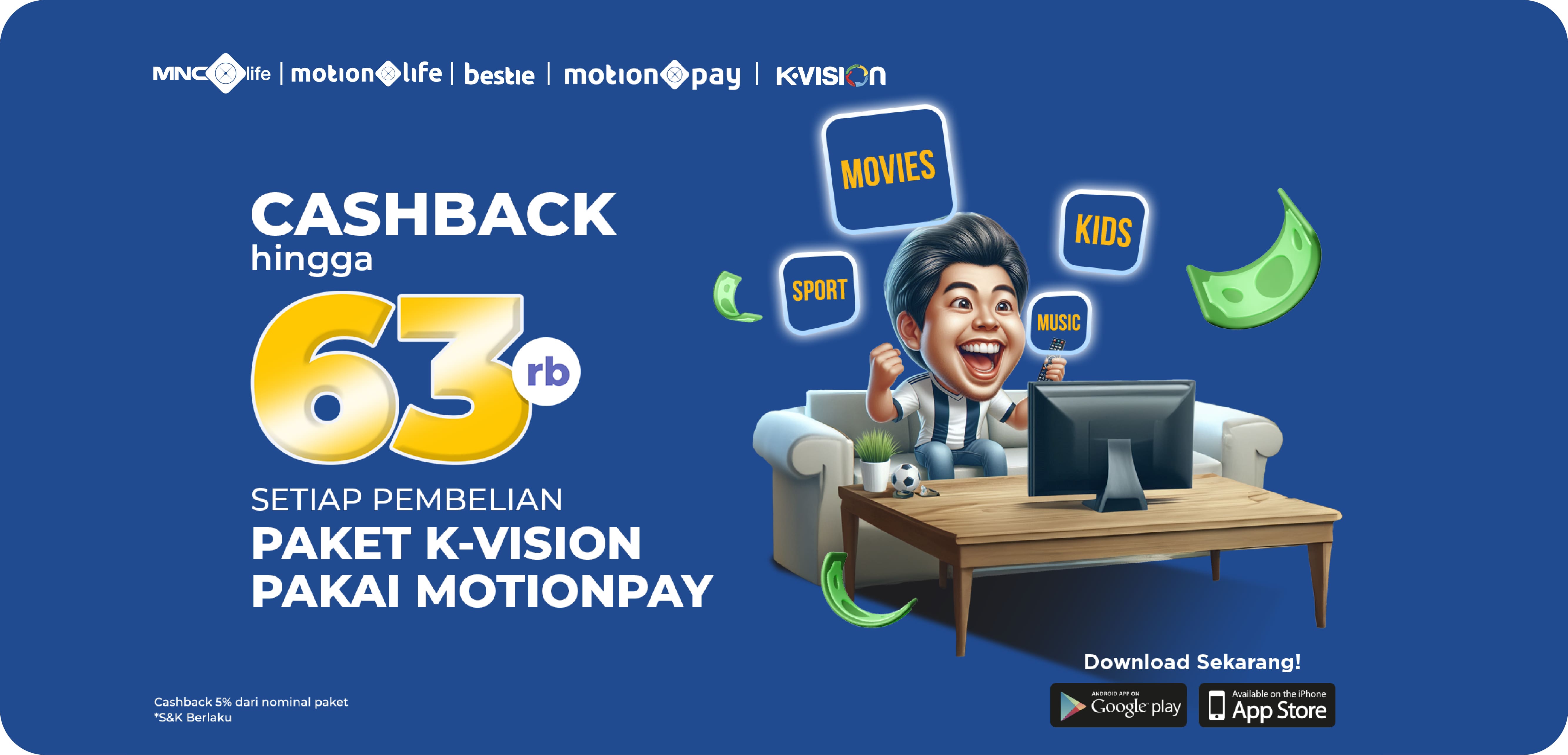 Dapatkan cashback hingga Rp63.000 untuk setiap pembelian paket K-Vision melalui aplikasi MotionPay.